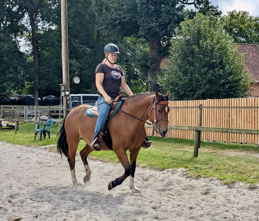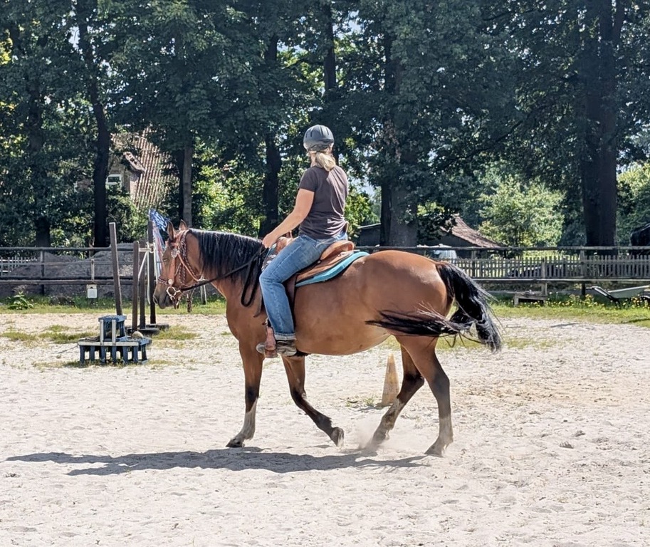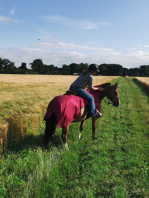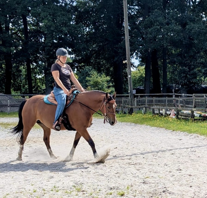 In einer sicheren, ruhigen Umgebung mit Pferdegesellschaft zeigt Hilda nach und nach ihr Potential als Reitpferd. Sie wurde entspannter, nachgiebiger und reagierte gut auf die Reiterhilfen. So konnte