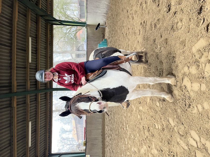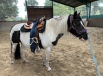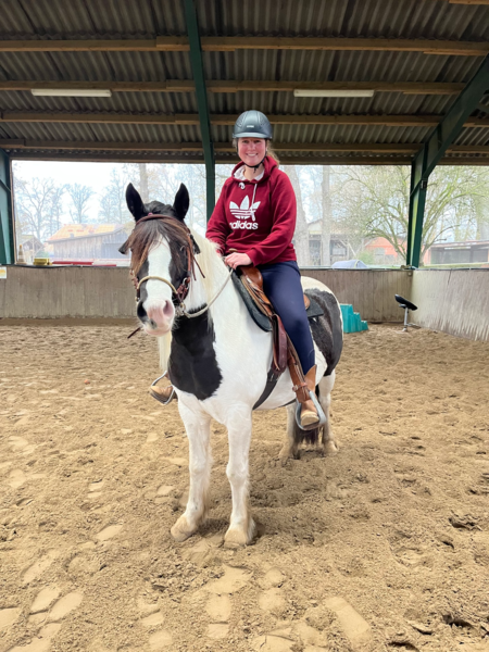 Mika ist eine 5-jährige Quarter-Tinker-Mix Stute und war von September 2025 bis Januar 2026 bei mir in der Ausbildung. Sie ist ein sehr menschenbezogenes, kuscheliges Pferdchen und zeigte sich brav und lernwillig. Dazu ist sie sehr cool und unerschrocken, man kann sagen sie hat von beiden Rassen das Beste abbekommen! So verlief die Ausbildung von Mika reibungslos und es machte großen Spaß mit ihr zu arbeiten. Sie war fleißig und verstand die Hilfen schnell. Die Tempokontrolle mussten wir uns etwas länger erarbeiten (zunächst bot sie nur schnell vorwärts oder stehenbleiben an) ebenso wie die Nachgiebigkeit und die Biegung, vor allem auf der linken Hand. Aber auch dort ist Mika auf einem guten Weg ein tolles Westernpferd zu werden. Im Gelände geht sie neugierig und mutig voran und wird ihren Besitzern hoffentlich viel Freude machen. So ein tolles Pferd nach der intensiven gemeinsamen Zeit wieder gehen zu lassen ist wirklich schwer!